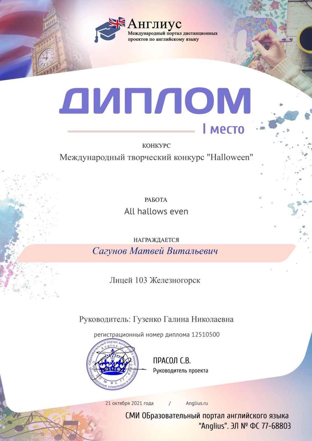 Наш лицеист Матвей Сагунов ( 11 "П" класс) принял участие в международном творческом конкурсе "Англиус" и занял первое место!
