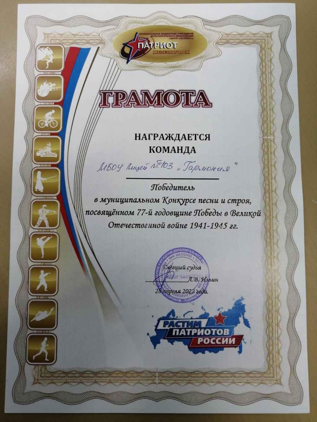 В Железногорске прошел городской конкурс песни и строя, посвященный 77-й годовщине победы в Великой Отечественной войне.