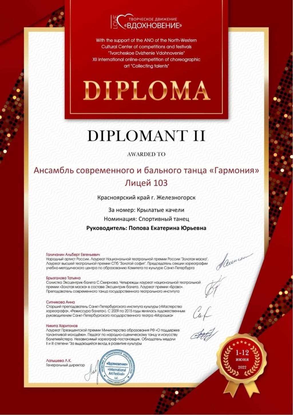 4. Ансамбль современного и бального танца "Гармония" под руководством Поповой Е.Ю. стал Дипломантом II степени в творческом движении "Вдохновение". Ребята представляли номер "Крылатые качели".