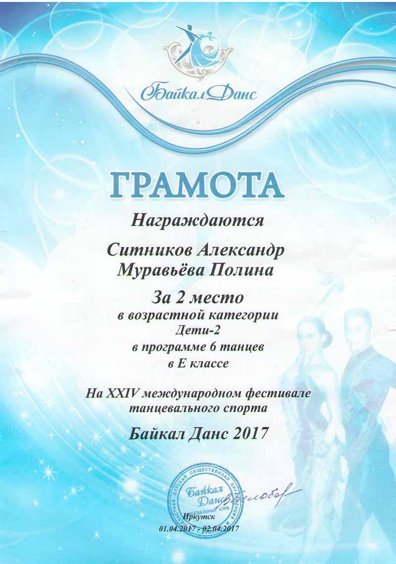 В Иркутске закончился XXIV международный фестиваль танцевального спорта «Байкал данс - 2017», где выступили Ситников Александр (учащийся 3 «А» класса) со своей партнершей Муравьёвой Полиной. Танцоры заняли 2 место в возрастной категории Дети - 2 в программе 6 танцев в «Е» классе и 3 место в Европейской программе в «Е» классе в той же возрастной категории.