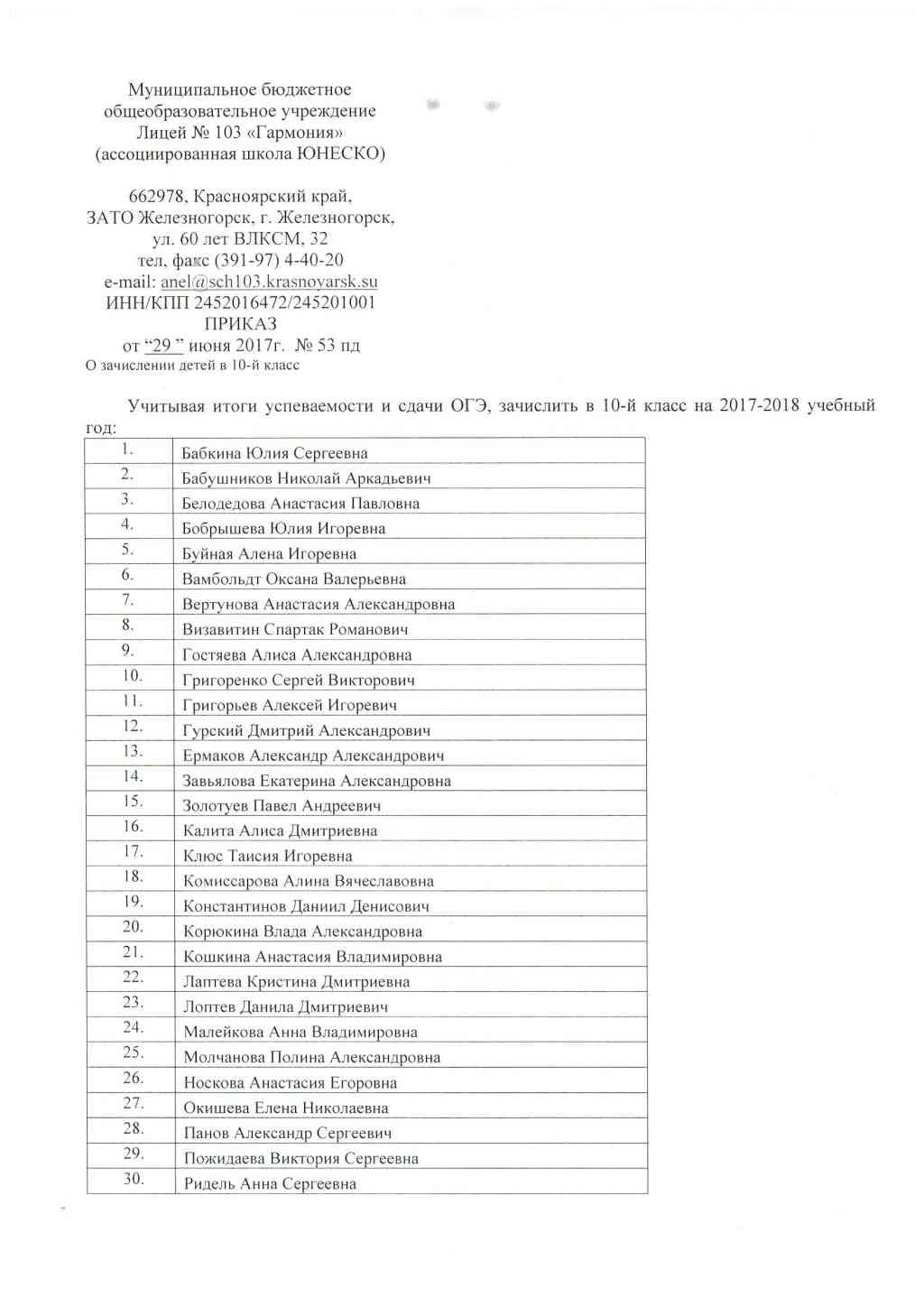 Приказ о зачислении детей в 10 класс