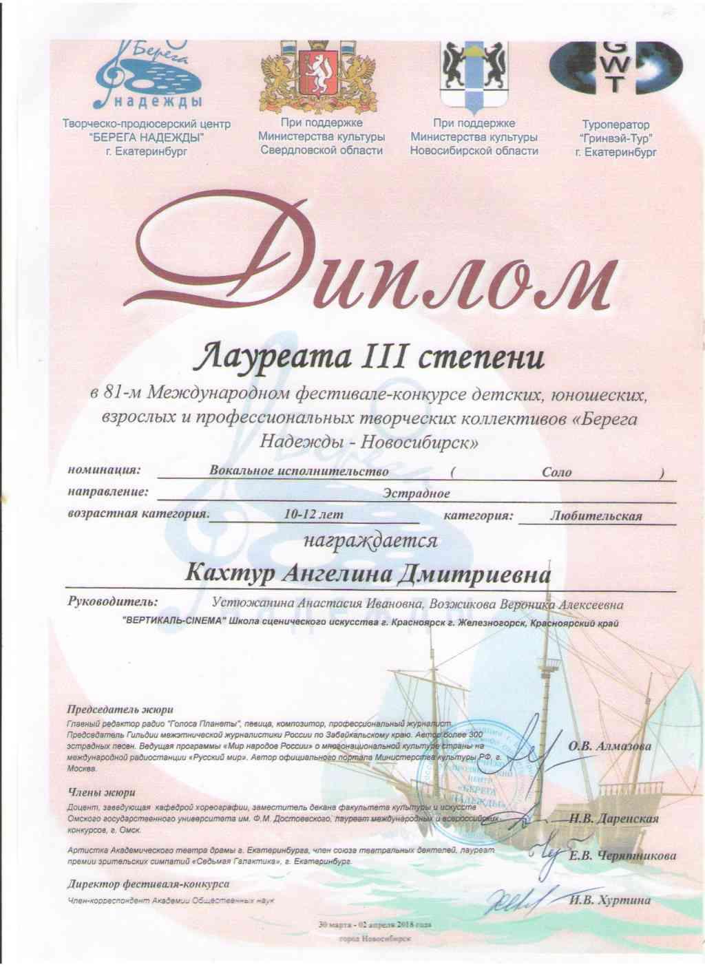 А в - третьих, она приняла участие в 81-м Международном фестивале - конкурсе детских юношеских, взрослых и профессиональных творческих коллективов «Берега Надежды – Новосибирск» (30 марта - 2 апреля 2018г.) в номинации «Вокальное исполнительство (соло)», по направлению эстрадное пение и удостоилась звания ЛАУРЕАТА III СТЕПЕНИ!