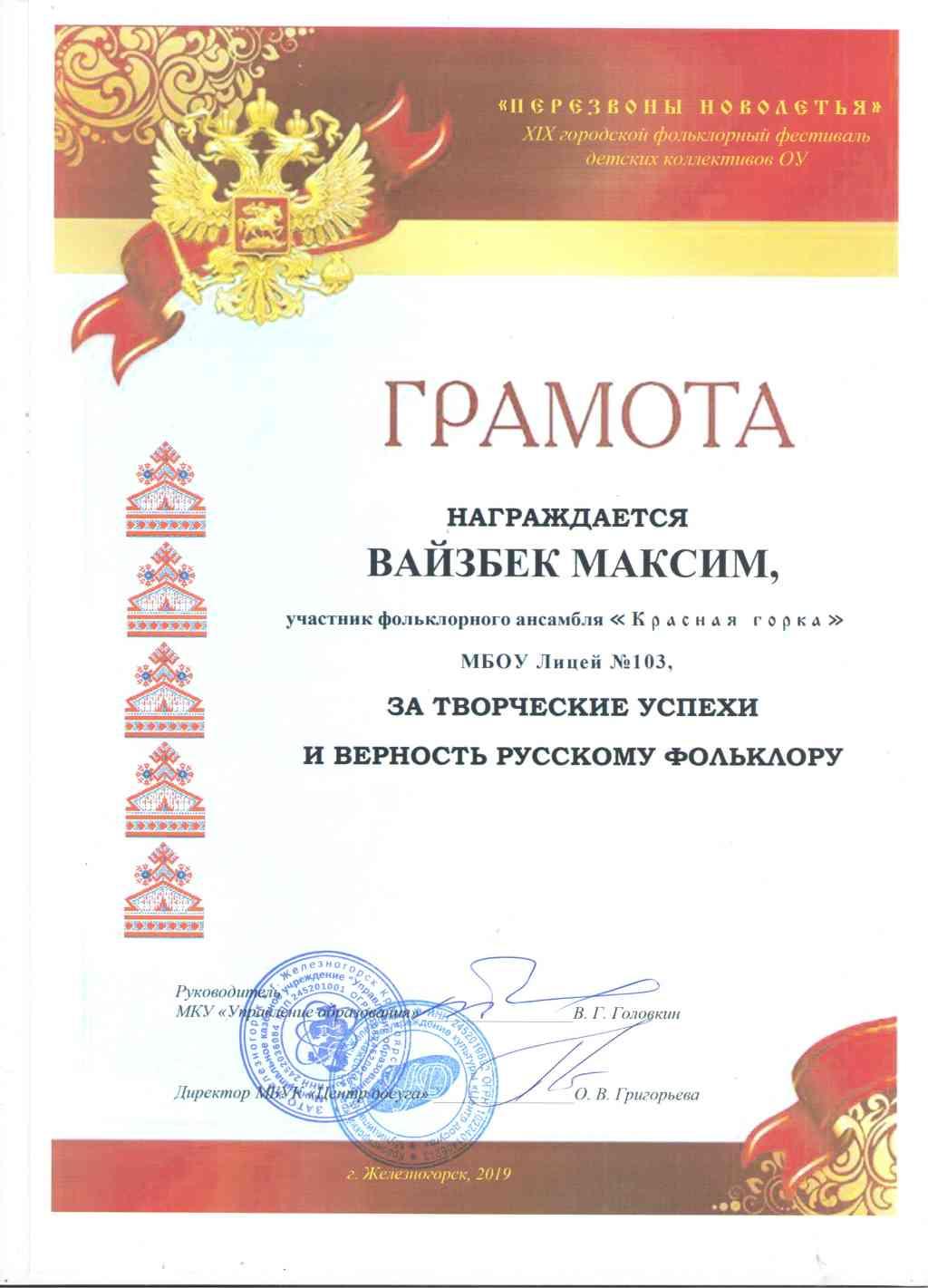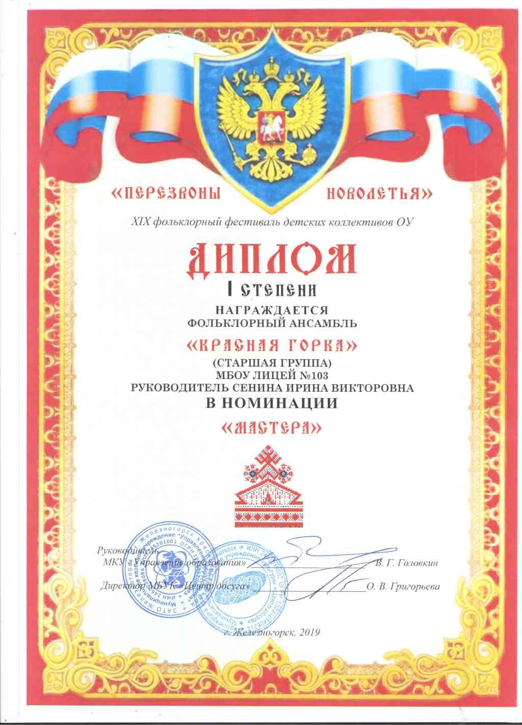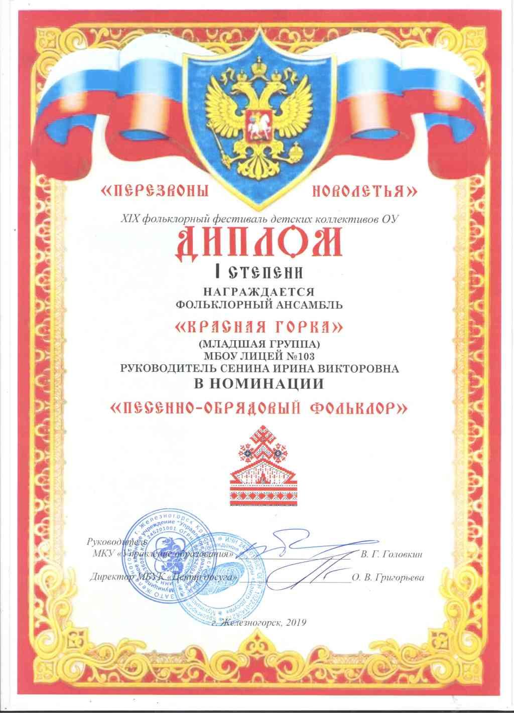5-6 марта вМБУК «Центр Досуга» состоялся XVIX городской фольклорный фестиваль «Перезвоны Новолетья». Фольклорный ансамбль «Красная горка» представил зрителям фестиваля разнообразную концертную программу, включающую в себя различные вокальные и хореографические жанры (скоморошина, былина, кадриль, протяжная лирическая, свадебная) и был награжден дипломом 1 степени в номинации «Мастера» (старшая группа) и дипломом 1 степени в номинации «Песенно – обрядовый фольклор» (младшая группа). Учителя, педагоги и учащиеся лицея оформили замечательную выставку «Мастеровой двор», за которую были отмечены грамотами за сохранение традиций русского прикладного творчества (Ломакина Г. Н., Ошкина Л.В., Сенина И.В., Чихватова О.К., Титова Л.В., Чумичев А.Ю.). Ярко и эмоционально выступили в конкурсе «Русская коса – девичья краса» Баева Анастасия и Смирнова Софья. За творческие успехи и верность русскому фольклору многие участники фольклорного ансамбля были удостоены персональных грамот (Шабанова Диана(9а), Дутова Полина (8а), Вайзбек Максим, Пушков Алексей (7м), Смирнова Софья (7а), Баева Анастасия(5а), Макарова Юлия, Протопопова Вероника, Франтикова Валерия (5д).