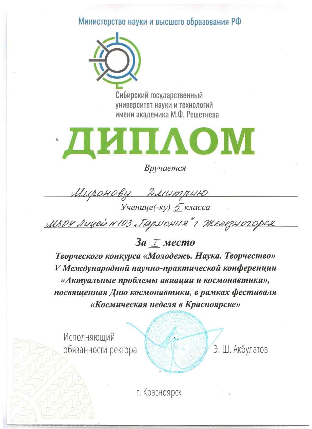 9 апреля 2019 года команда «Капитан КИМ» (Парфёнов Иван и Жарков Кирилл, участники проекта «Воздушно-инженерная школа. Cansat в России») приняла участие в работе школьной секции творческого конкурса «Молодежь. Наука. Творчество» V Международной научно-практической конференции, посвященной Дню космонавтики «Актуальные проблемы авиации и космонавтики».