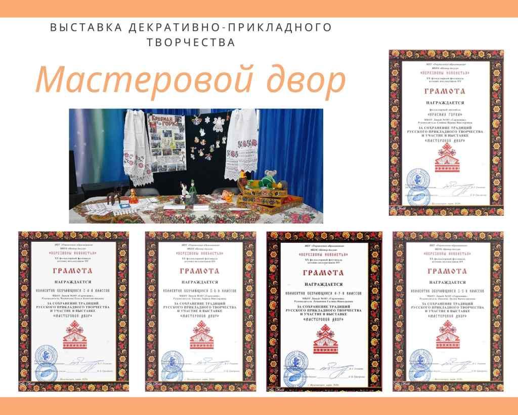 Учителя, педагоги и учащиеся лицея оформили замечательную выставку «Мастеровой двор», за которую были отмечены грамотами за сохранение традиций русского прикладного творчества (Ломакина Г.Н., Ошкина Л.В., Сенина И.В., Титова Л.В., Чихватова О.К.). Ярко, эмоционально проявили себя в частушечном батле Вайзбек Максим, Смирнова Софья и Баева Анастасия. За творческие успехи и верность русскому фольклору многие участники фольклорного ансамбля были удостоены персональных грамот (Жбанова Карина-выпускница Лицея, Шабанова Диана-10п, Дутова Полина -9д, Вайзбек Максим -8м, Смирнова Софья -8а, Баева Анастасия-6а). Организаторам фестиваля, в том числе Сениной И.В. будут вручены благодарственные письма за активное участие в организации и проведении всехфестивалей «Перезвоны Новолетья».