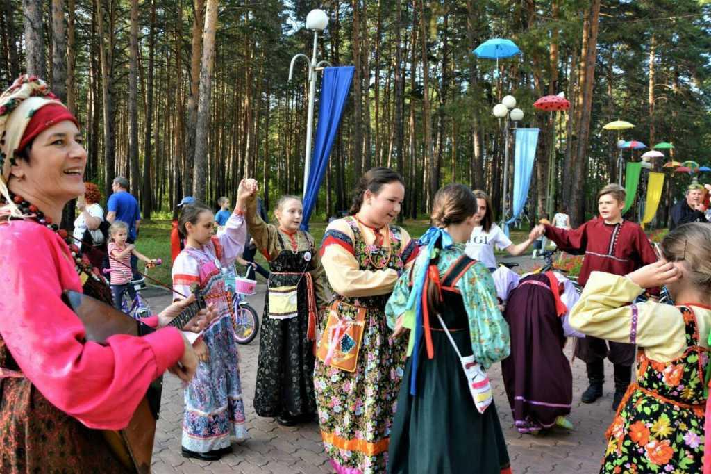Традиционно, выступление фольклорного ансамбля началось на сцене у фонтана и продолжилось на главной аллее. В течение часа, участники ансамбля знакомили детей с народными играми (подвижными, круговыми хороводными, с припевами), развивающими смекалку, внимание и умение взаимодействовать в коллективе.