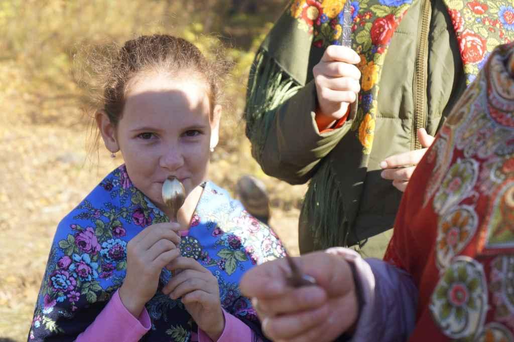 На празднике пели старинные осенние песни, водили осенние хороводы и угощались кашами из разных круп. По традиции, был сооружен обрядовый костёр - с колесом наверху - в благодарность уходящему солнцу!