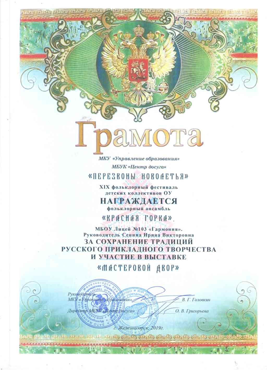 5-6 марта вМБУК «Центр Досуга» состоялся XVIX  городской фольклорный фестиваль «Перезвоны Новолетья». Фольклорный ансамбль «Красная горка»  представил  зрителям фестиваля разнообразную концертную программу, включающую в себя различные вокальные и хореографические жанры (скоморошина, былина, кадриль, протяжная лирическая, свадебная) и был награжден дипломом 1 степени в номинации «Мастера» (старшая группа) и дипломом 1 степени в номинации «Песенно – обрядовый фольклор» (младшая группа). Учителя, педагоги и учащиеся лицея оформили замечательную выставку «Мастеровой двор», за которую были отмечены грамотами за сохранение традиций русского прикладного творчества (Ломакина Г. Н., Ошкина Л.В., Сенина И.В., Чихватова О.К., Титова Л.В., Чумичев А.Ю.).  Ярко и эмоционально выступили  в конкурсе «Русская коса – девичья краса» Баева Анастасия и Смирнова Софья. За творческие успехи и верность русскому фольклору многие участники фольклорного ансамбля были удостоены персональных грамот (Шабанова Диана(9а), Дутова Полина (8а),  Вайзбек Максим, Пушков Алексей (7м), Смирнова Софья (7а), Баева Анастасия(5а), Макарова Юлия, Протопопова Вероника, Франтикова Валерия (5д).